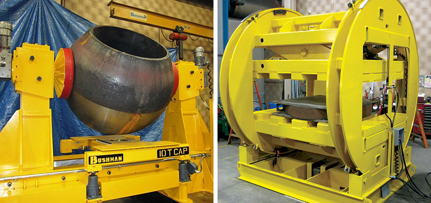 This Bushman Equipment, Inc. C-frame inverter was designed for high capacity, high cycle operations. An industrial gear motor drives rotation on machined wheels that roll on permanently lubricated bearings. C-frame inverters are PLC-controlled so they can easily be integrated into automated process lines.