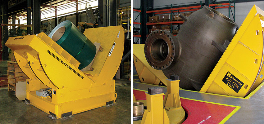 Pit mounted upenders allow the platforms to be flush with the floor to facilitate loading or worker interface.